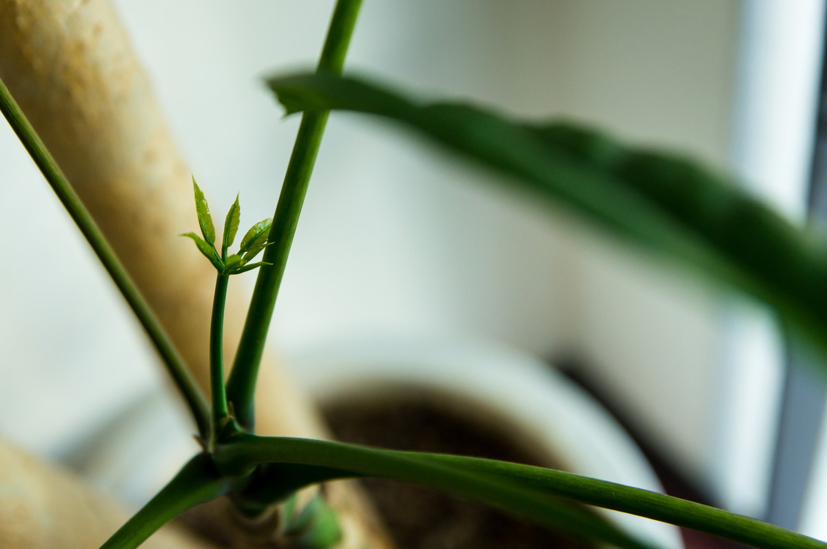 植物たちの水やりに会社の事務所へ寄ったらパキラの新葉を発見。